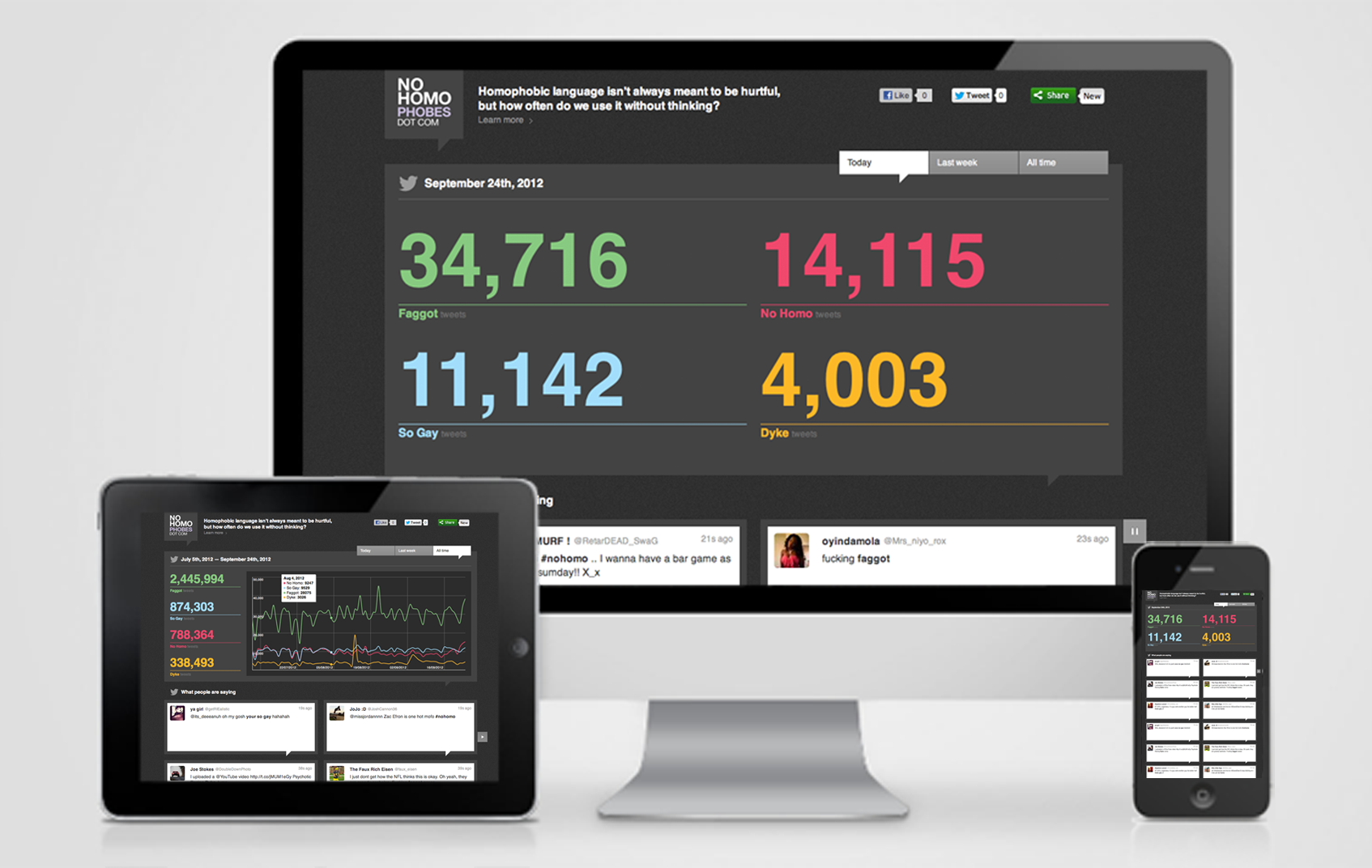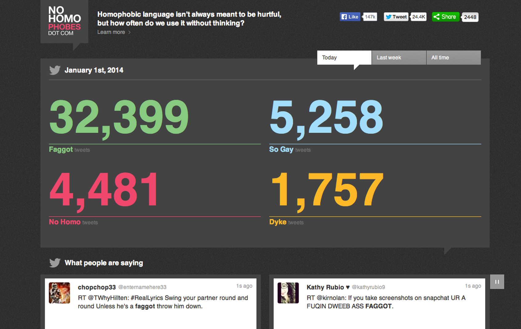 To show how frequently and casually homophobic language is used, tweets featuring "so gay", "no homo", "faggot" and "dyke" were pulled, tracked and displayed in real time on this website.